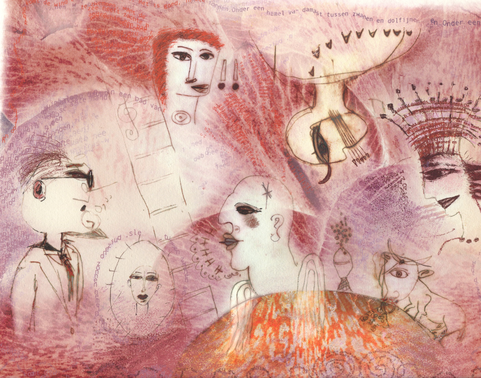 bovenaan lezen we in golvende zinnen onder andere : onder een hemel van damast tussen zwanen en dolfijnen